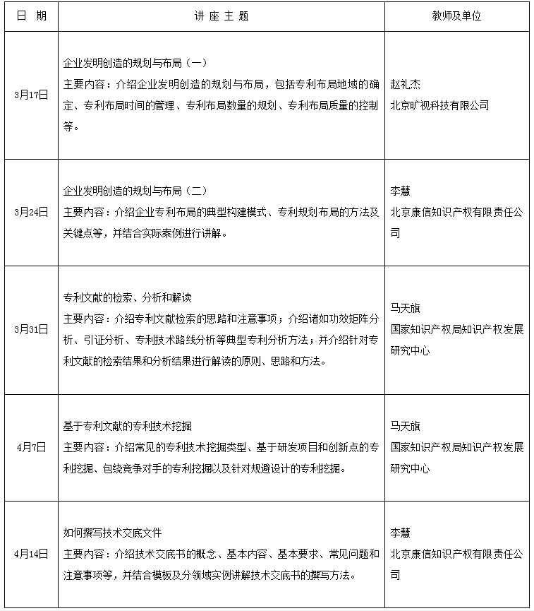 “专利创造质量提升”专题公益讲座(2017年3月17日—4月14日)