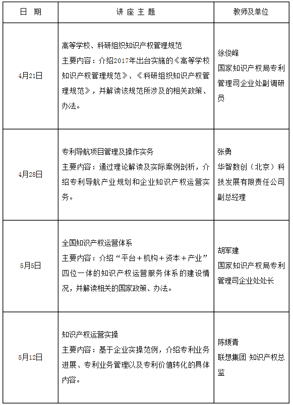 “知识产权运营”专题公益讲座(2017年4月21日—5月12日)