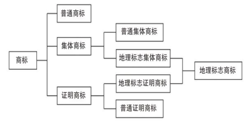 商标法第十六条定义“地理标志”为“标示某商品源于某地区,其特定质量、信誉等特征主要由该地区自然或人文因素决定的标志”。配套的商标法实施条例第四条规定,商标法第十六条规定的地理标志,可依相关规定作为证明商标或集体商标申请注册。这进一步细分集体商标、证明商标为地理标志集体商标和普通集体商标、地理标志证明商标和普通证明商标(如下图),地理标志集体商标和地理标志证明商标统称地理标志商标。