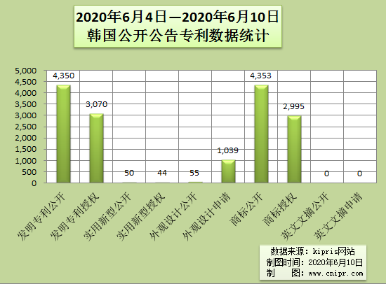 2020年6月4日—2020年6月10日韩国公开公告专利数据统计
