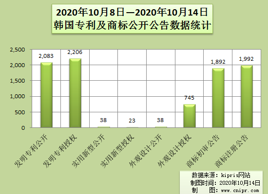 2020年10月8日—2020年10月14日韩国专利及商标公开公告数据统计