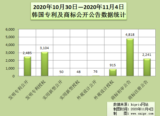 2020年10月30日—2020年11月4日韩国专利及商标公开公告数据统计