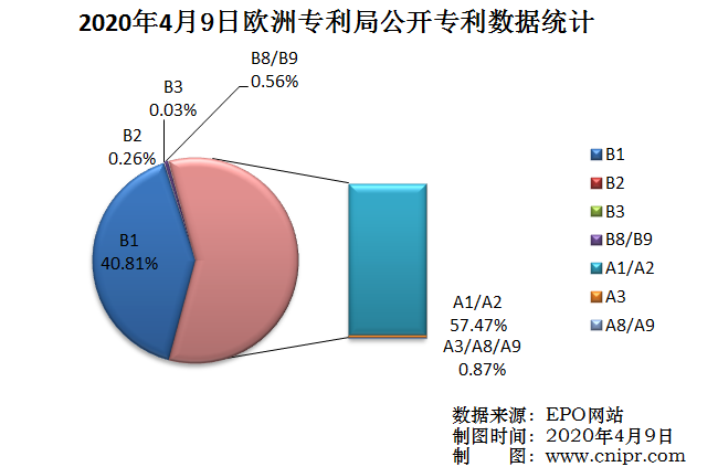2020年4月9日,欧洲专利局(EPO)公开A类以及B类专利7665件。公布的授权专利(B1):3128件,占总公开量的40.81%;新的专利说明书(B2):20件,占总公开量的0.26%;经限制性修改程序修改后再次公告出版的说明书(B3):2件,占总公开量的0.03%;授权专利扉页的更正/授权专利全文的更正(B8/B9):43件,占总公开量的0.56%;公开新增专利(A1/A2):4405件,占总公开量的57.47%;检索报告(A3):67件,占总公开量的0.87%;扉页的更正/全文说明书的更正(A8/A9):0件,占总公开量的0.00%。