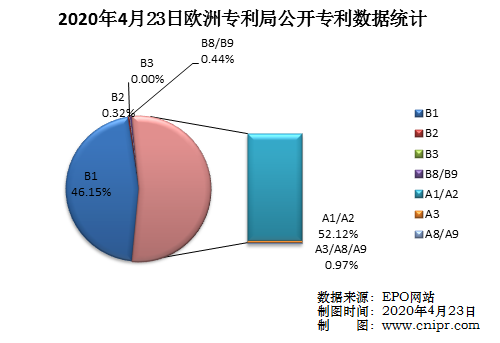2020年4月23日,欧洲专利局(EPO)公开A类以及B类专利6800件。公布的授权专利(B1):3138件,占总公开量的46.15%;新的专利说明书(B2):22件,占总公开量的0.32%;经限制性修改程序修改后再次公告出版的说明书(B3):0件,占总公开量的0.00%;授权专利扉页的更正/授权专利全文的更正(B8/B9):30件,占总公开量的0.44%;公开新增专利(A1/A2):3544件,占总公开量的52.12%;检索报告(A3):62件,占总公开量的0.91%;扉页的更正/全文说明书的更正(A8/A9):4件,占总公开量的0.06%。