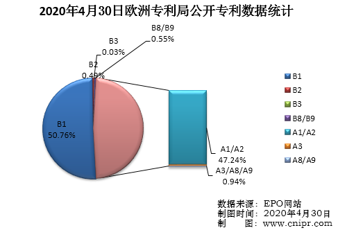 2020年4月30日,欧洲专利局(EPO)公开A类以及B类专利6728件。公布的授权专利(B1):3415件,占总公开量的50.76%;新的专利说明书(B2):33件,占总公开量的0.49%;经限制性修改程序修改后再次公告出版的说明书(B3):2件,占总公开量的0.03%;授权专利扉页的更正/授权专利全文的更正(B8/B9):37件,占总公开量的0.55%;公开新增专利(A1/A2):3178件,占总公开量的47.24%;检索报告(A3):57件,占总公开量的0.85%;扉页的更正/全文说明书的更正(A8/A9):6件,占总公开量的0.09%。
