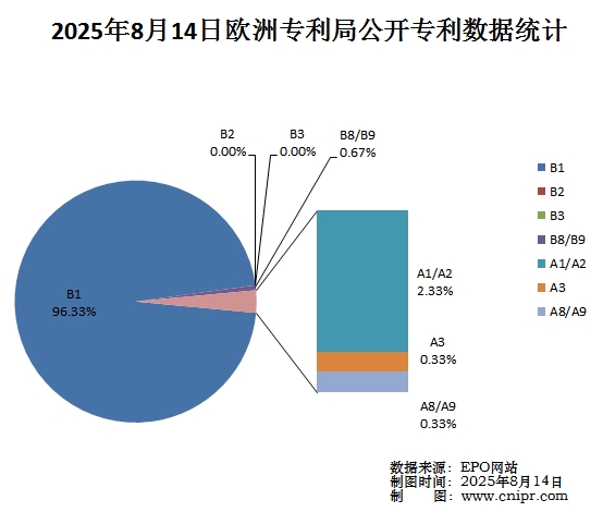 2025年8月14日,欧洲专利局(EPO)公开A类以及B类专利300件。经审查的授权专利说明书(B1):289件,占总公开量的96.33%;修正的专利说明书(B2):0件,占总公开量的0.00%;限制程序后公布(B3):0件,占总公开量的0.00%;授权专利扉页的更正/授权专利全文的更正(B8/B9):2件,占总公开量的0.67%;专利申请公布(A1/A2):7件,占总公开量的2.33%;检索报告(A3):1件,占总公开量的0.33%;专利扉页更正/专利全文更正(A8/A9):1件,占总公开量的0.33%。