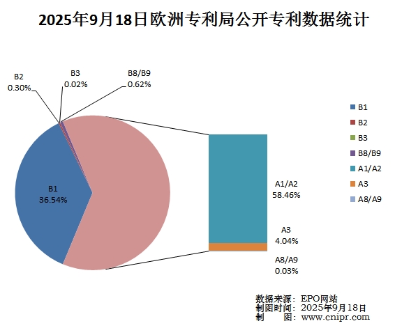 2025年9月18日,欧洲专利局(EPO)公开A类以及B类专利6016件。经审查的授权专利说明书(B1):2198件,占总公开量的36.54%;修正的专利说明书(B2):18件,占总公开量的0.30%;限制程序后公布(B3):1件,占总公开量的0.02%;授权专利扉页的更正/授权专利全文的更正(B8/B9):37件,占总公开量的0.62%;专利申请公布(A1/A2):3517件,占总公开量的58.46%;检索报告(A3):243件,占总公开量的4.04%;专利扉页更正/专利全文更正(A8/A9):2件,占总公开量的0.03%。