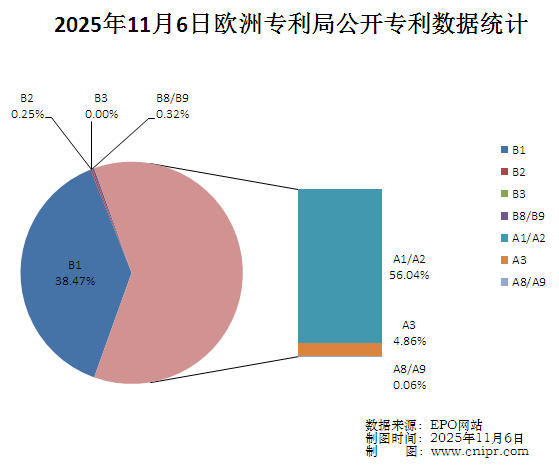 2025年11月6日,欧洲专利局(EPO)公开A类以及B类专利6911件。经审查的授权专利说明书(B1):2659件,占总公开量的38.47%;修正的专利说明书(B2):17件,占总公开量的0.25%;限制程序后公布(B3):0件,占总公开量的0.00%;授权专利扉页的更正/授权专利全文的更正(B8/B9):22件,占总公开量的0.32%;专利申请公布(A1/A2):3873件,占总公开量的56.04%;检索报告(A3):336件,占总公开量的4.86%;专利扉页更正/专利全文更正(A8/A9):4件,占总公开量的0.06%。