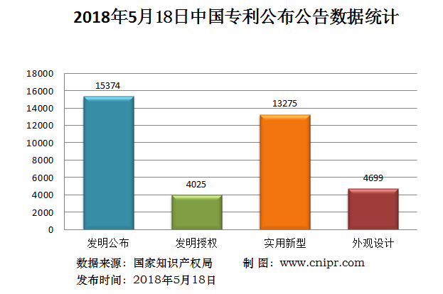 2018年5月18日,中国专利公布数据统计共37373件,其中:发明专利公布15374件;发明专利授权4025件;实用新型专利公告13275件;外观设计专利公告4699件。