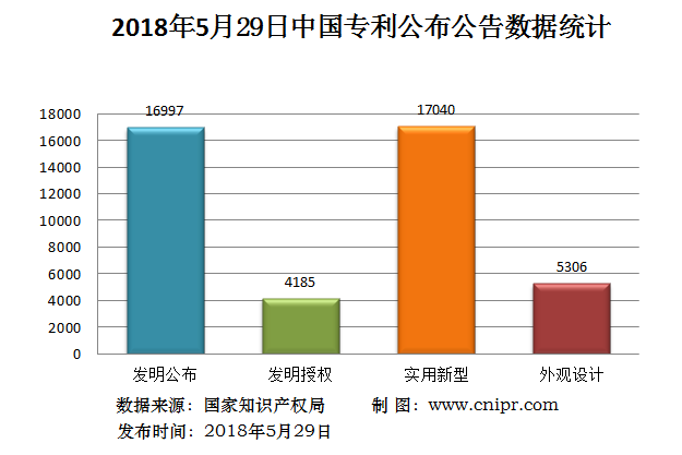 2018年5月29日,中国专利公布数据统计共43528件,其中:发明专利公布16997件;发明专利授权4185件;实用新型专利公告17040件;外观设计专利公告5306件。
