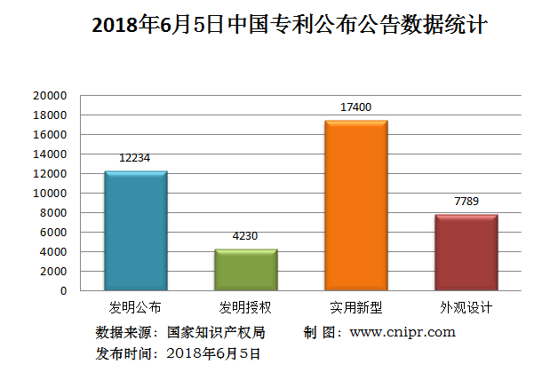 2018年6月5日,中国专利公布数据统计共41653件,其中:发明专利公布12234件;发明专利授权4230件;实用新型专利公告17400件;外观设计专利公告7789件。