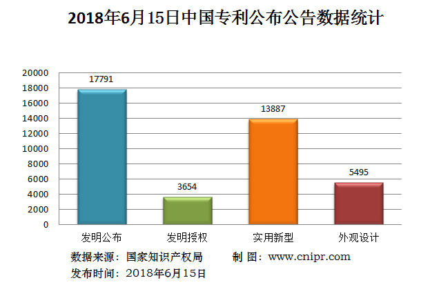 2018年6月15日,中国专利公布数据统计共40827件,其中:发明专利公布17791件;发明专利授权3654件;实用新型专利公告13887件;外观设计专利公告5495件。