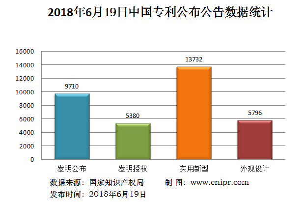 2018年6月19日,中国专利公布数据统计共34618件,其中:发明专利公布9710件;发明专利授权5380件;实用新型专利公告13732件;外观设计专利公告5796件。