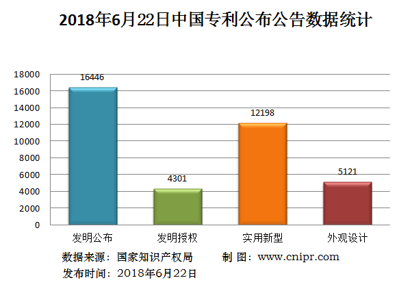 2018年6月22日,中国专利公布数据统计共38066件,其中:发明专利公布16446件;发明专利授权4301件;实用新型专利公告12198件;外观设计专利公告5121件。