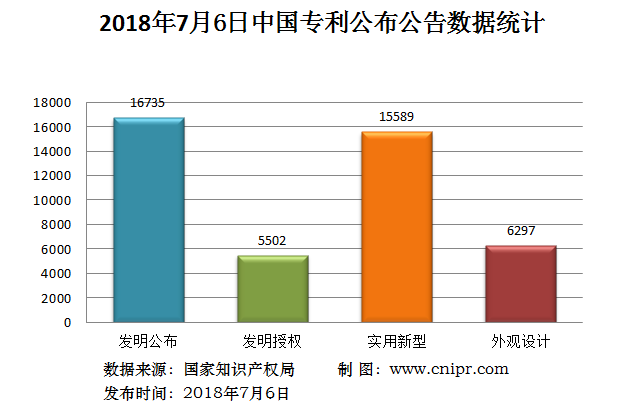 2018年7月6日,中国专利公布数据统计共44123件,其中:发明专利公布16735件;发明专利授权5502件;实用新型专利公告15589件;外观设计专利公告6297件。