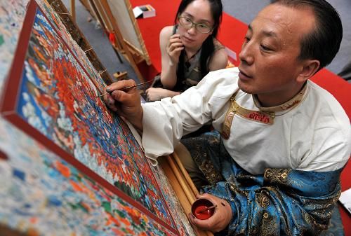 热贡艺术代表性传承人、来自青海的土族工艺美术师娘本在现场绘制唐卡。新华社记者 马宁 摄