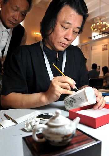 汕头陶瓷微书代表性传承人王芝文现场展示陶瓷微书技艺。新华社记者 马宁 摄