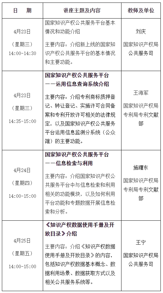 专利文献馆2025年4月公益讲座计划:“知识产权公共服务资源与利用”专题