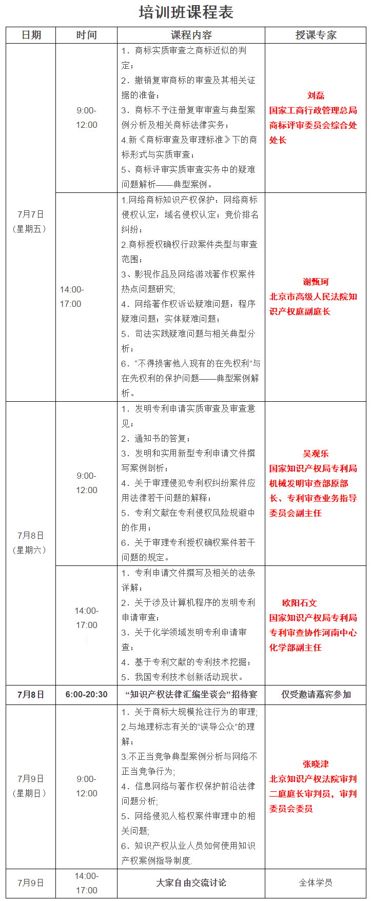 本次培训班邀请到商标、专利、知识产权法院等领域资深名师,主要围绕商标、专利、版权实务及新《商标审查及审理标准》下的商标形式与实质审查、商标评审实质审查实务中的疑难问题解析及典型案例、基于专利文献的专利技术挖掘、关于审理侵犯专利权纠纷案件应用法律若干问题的解释、专利文献在专利侵权风险规避中的作用、我国专利技术创新活动现状、网络商标知识产权保护:网络商标侵权认定、域名侵权认定、竞价排名纠纷、网络著作权诉讼疑难问题、程序疑难问题、实体疑难问题、影视作品及网络游戏著作权案件热点问题研究、知识产权从业人员如何使用知识产权案例指导制度等众多知识产权相关领域内容开展实务培训。