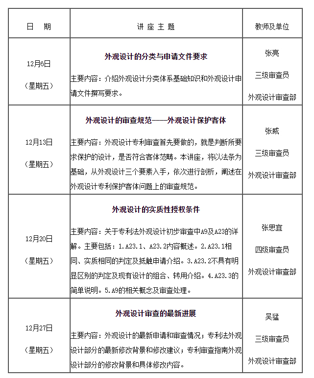 “外观设计审查”专题公益讲座(2019年12月6日-27日)