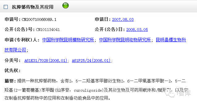 值得一提的是,中华民族的瑰宝—中医药,在抗抑郁中正在发挥独特的作用。小i发现,2007年8月,由中国科学院昆明植物研究所、中国科学院昆明动物研究所、昆明晶镖生物科技有限公司合作申请了题为“一种抗抑郁药物”(专利号:CN200710066088.7)的专利,其有效成分就是从传统中药仙茅中分离得到的小分子化合物奥生乐赛特。该专利于2010年2月获得授权。