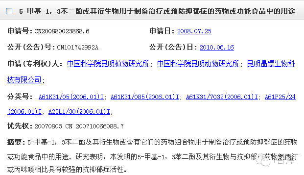 一年后,上述机构又将该抗抑郁药物申请了PCT专利,题为“5-甲基-1,3苯二酚或其衍生物用于制备治疗或预防抑郁症的药物或功能食品”(专利号:CN200880023868.6)。该专利于2013年1月获得授权。