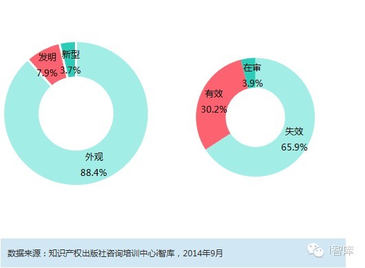在cnipr专利检索平台检索到月饼的相关专利5705件,其中88.4%的专利为外观设计专利,即涉及月饼包装材料的外观专利,发明专利和实用新型专利分别占7.9%和3.7%。而在这超过5000件的专利中,有效专利仅有1723件,超过3000件专利因专利权终止而失效。可见,整个行业的专利数量大但有效率低,保护形式和技术领域过于单一。