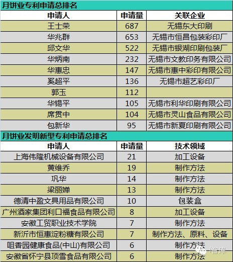 由于月饼专利以外观设计为主,前十申请人均为个人,所申请专利均为包装盒的外观设计专利,且申请人多是印刷包装公司的负责人,可以说这些企业在月饼包装行业可谓经验丰富,而发明和实用新型专利的前十申请人多涉及加工设备、制作方法和包装盒技术领域。