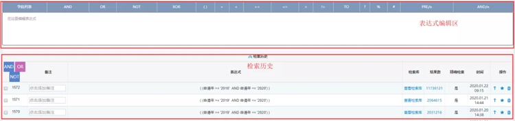 表格检索包括数据库选择区、快速筛选区、关键字输入区、表达式编辑区和检索历史。