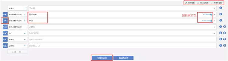 用户选择数据库,选择字段并输入关键字,在最左侧可以切换逻辑运算符并生成表达式。
