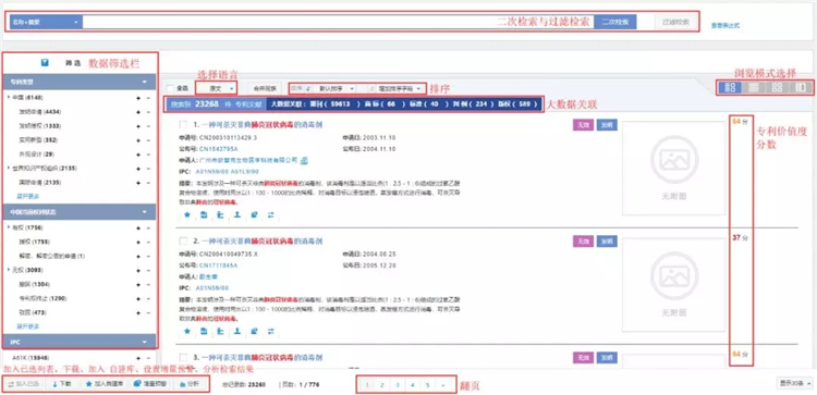 用户可以对检索结果进行排序、分析、下载、加入用户自建库、设置增量预警、加入已选等操作。对检索结果还可以进行二次检索和过滤检索。可以切换图文浏览、表格浏览、外观浏览和概细览四种浏览模式。在左侧筛选栏可以对数据进行快速筛选和过滤。