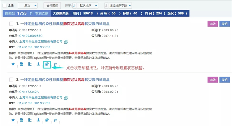 第一种方式在检索结果概览界面菜单中,每篇专利下面的菜单栏里点“预警”按钮,可以对该篇专利设置状态预警。