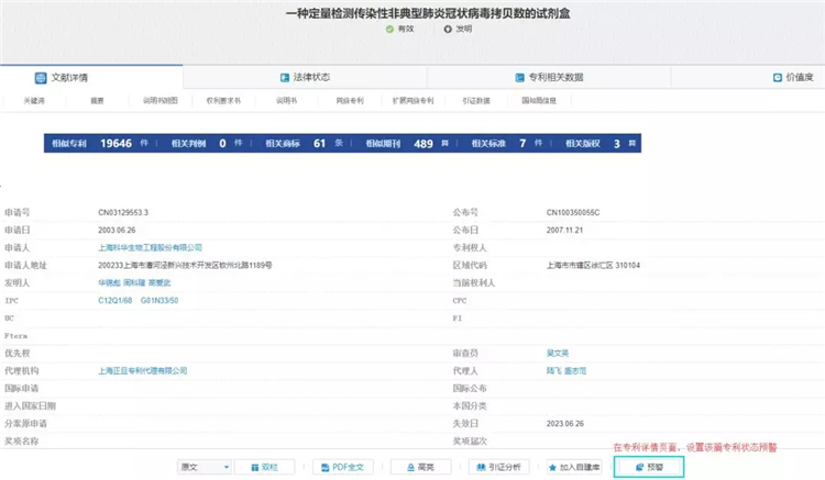 第二种方式,在专利详情页面下方菜单栏点击“预警”按钮设置该篇专利的状态预警。