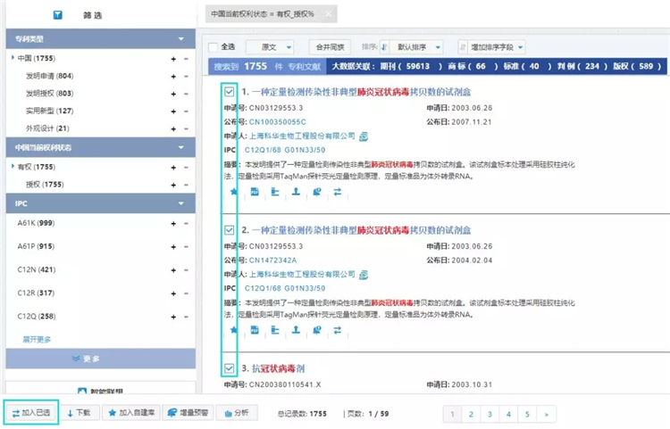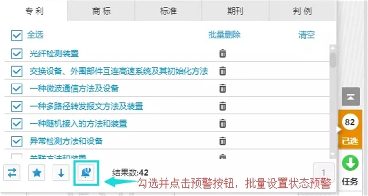第三种方式,在概览页面勾选要设置预警的专利并点击“加入已选”,打开已选列表,勾选之后可以批量设置状态预警。