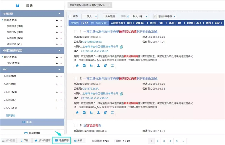 第一种方式,用户可以使用DIInspiro概览页面中提供的增量预警功能来实现对当前检索条件设置增量预警。通过点击底部工具栏的