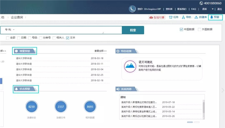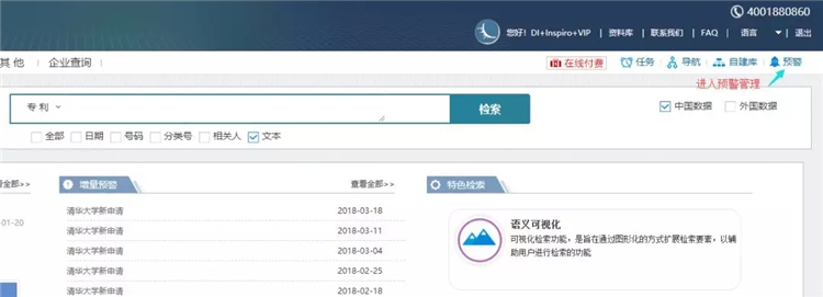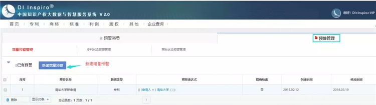 DIInspiro首页有增量预警与状态预警消息推送,用户可以点击页面右上角的“预警”进入预警管理查看详情。