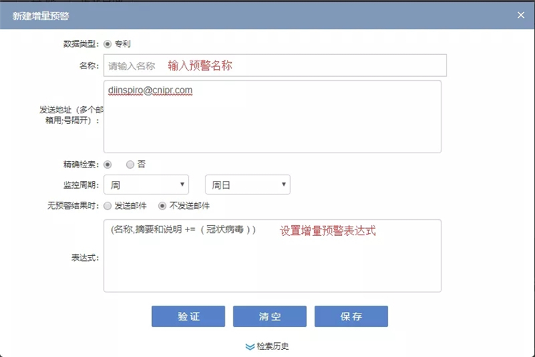 按钮进入预警管理页面,点击“预警管理”-新建增量预警,用户可以手动输入或者拷贝一个检索表达式以新建一个增量预警。
