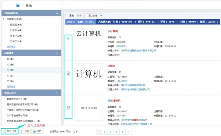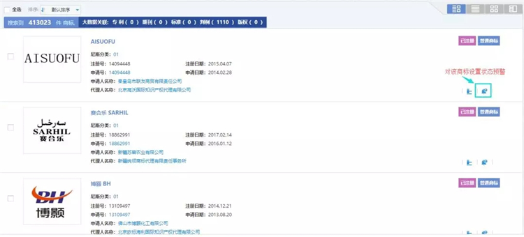 第二种方式,在商标概览页面,勾选商标并加入已选列表,在已选列表中批量设置状态预警。