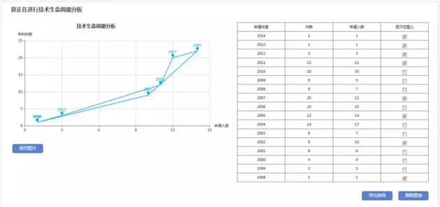 生命周期分析通过对一项技术或一个行业的专利集合从专利申请数量和申请人数量的维度进行统计分析,以展示该技术/行业的发展情况,用户可以从分析图了解其当前发展状态并预估发展趋势。
