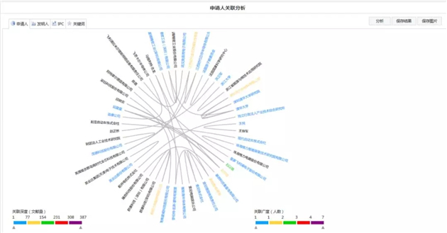 关联关系分析,对项目数据中的申请人进行分析,展示申请人的合作关系图谱。用户可以设置合作申请人的数量和合作申请专利文献的数量两个数值范围。