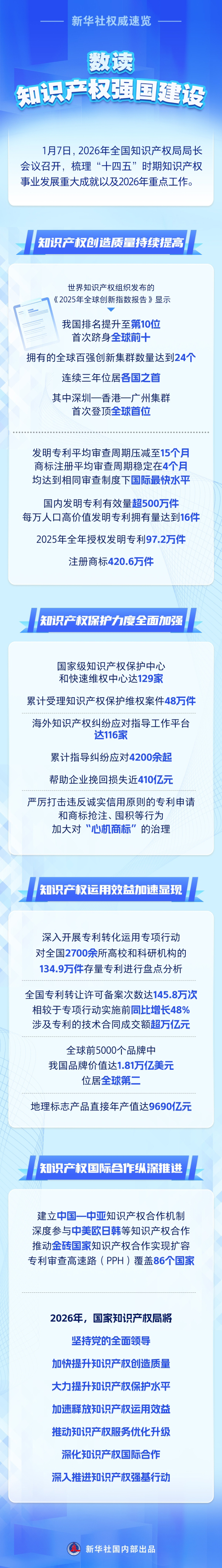 摘要:1月7日,2026年全国知识产权局局长会议召开,梳理“十四五”时期知识产权事业发展重大成就以及2026年重点工作。