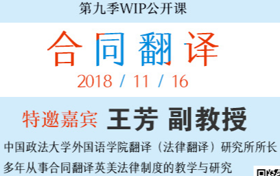 第九季WIP公开课将于11月16日正式开播,将由中国政法大学外国语学院翻译(法律翻译)研究所所长王芳,为大家讲解合同翻译。