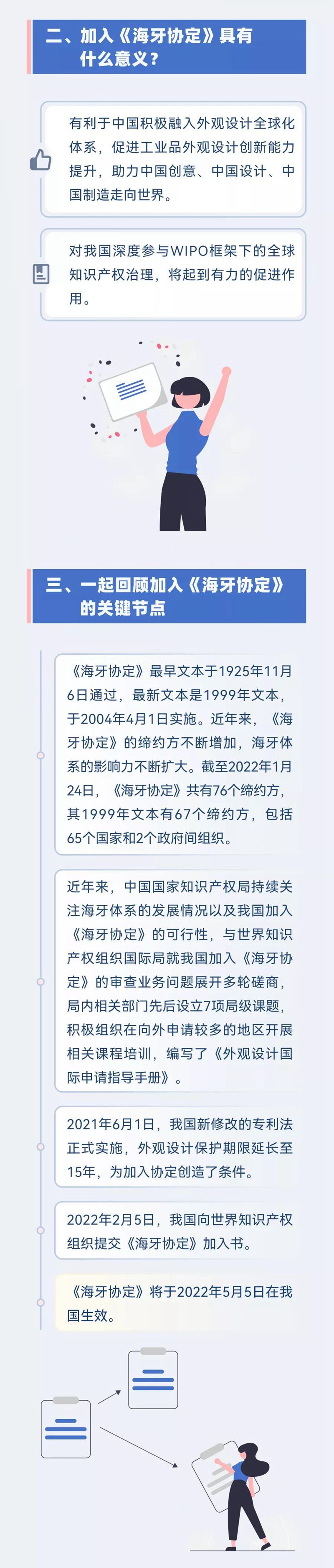 摘要:2月5日,我国向世界知识产权组织(WIPO)提交《工业品外观设计国际注册海牙协定》加入书,该协定将于今年5月5日在我国生效。