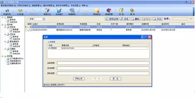 如果是新申请案件,签名通过后,案件从草稿箱中的新申请转移到发件箱中的新申请。先勾选发件箱的新申请案件,点界面上方的发送按钮,在弹出的界面中点开始上传按钮。