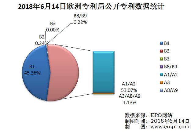 2018年6月14日,欧洲专利局(EPO)公开A类以及B类专利5512件。公布的授权专利(B1):2500件,占总公开量的45.36%;新的专利说明书(B2):13件,占总公开量的0.24%;经限制性修改程序修改后再次公告出版的说明书(B3):0件,占总公开量的0.00%;授权专利扉页的更正/授权专利全文的更正(B8/B9):12件,占总公开量的0.22%;公开新增专利:(A1/A2)2925件,占总公开量的53.07%;检索报告(A3):60件,占总公开量的1.09%;扉页的更正/全文说明书的更正(A8/A9):2件,占总公开量的0.04%。
