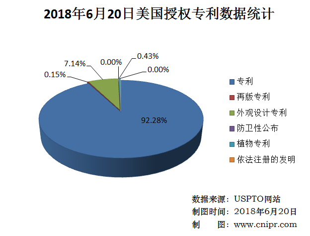 2018年6月20日,美国专利商标局(USPTO)公布授权专利9120件。专利(Utility)的授权量为8416件,占总量的92.28%;再版专利(Reissue)为14件,占总量的0.15%;外观设计专利(Design)为651件,占总量的7.14%;防卫性公布为0件,占总量的0.00%;植物专利(Plant)39件,占总量的0.43%;依法注册的发明(Statutory Invention Registration)0件,占总量的0.00%。