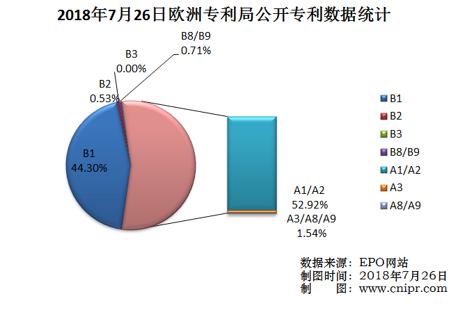 2018年7月26日,欧洲专利局(EPO)公开A类以及B类专利5643件。公布的授权专利(B1):2500件,占总公开量的44.30%;新的专利说明书(B2):30件,占总公开量的0.53%;经限制性修改程序修改后再次公告出版的说明书(B3):0件,占总公开量的0.00%;授权专利扉页的更正/授权专利全文的更正(B8/B9):40件,占总公开量的0.71%;公开新增专利:(A1/A2)2986件,占总公开量的52.92%;检索报告(A3):87件,占总公开量的1.54%;扉页的更正/全文说明书的更正(A8/A9):0件,占总公开量的0.00%。