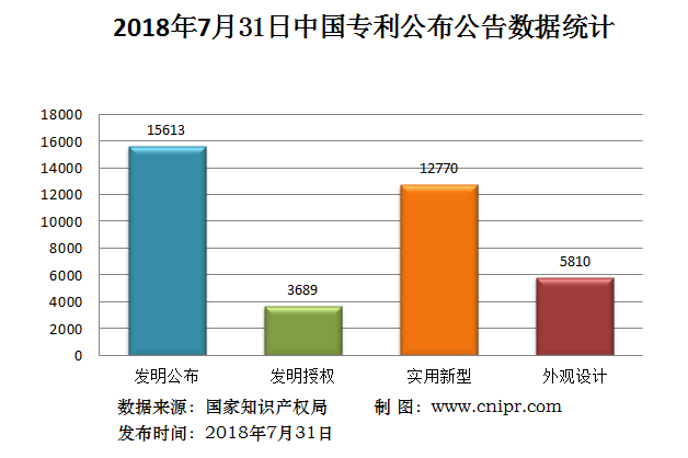 2018年7月31日,中国专利公布数据统计共37882件,其中:发明专利公布15613件;发明专利授权3689件;实用新型专利公告12770件;外观设计专利公告5810件。