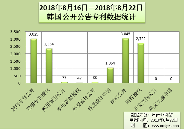 2018年8月16日—2018年8月22日韩国公开公告专利数据统计
