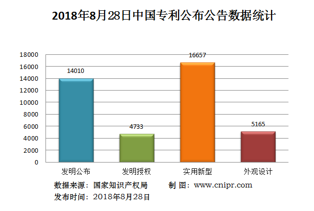 2018年8月28日,中国专利公布数据统计共40565件,其中:发明专利公布14010件;发明专利授权4733件;实用新型专利公告16657件,外观设计专利公告5165件。